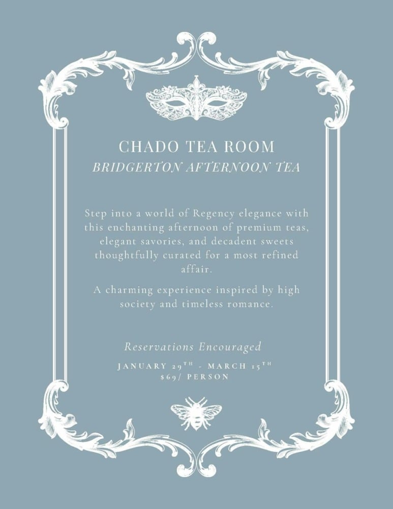 Chado Tea Room is offering an elegant tea experience with its Bridgerton Afternoon Tea Service, available through Sunday, March 15, at all Chado locations (Downtown LA, Hollywood, Torrance, and Pasadena).