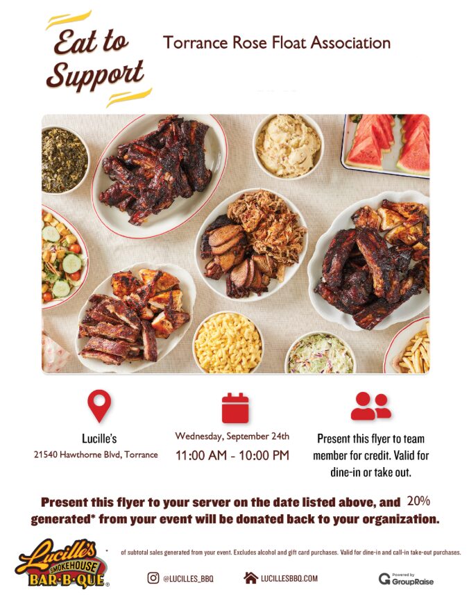 You’re invited to join the Torrance Rose Float Association (TRFA) for Restaurants for Roses, as they partner with Lucille’s Bar-B-Que to fundraise for the 2026 Torrance float. Our city’s very first float appeared in the 1914 Pasadena Tournament of Roses Parade!