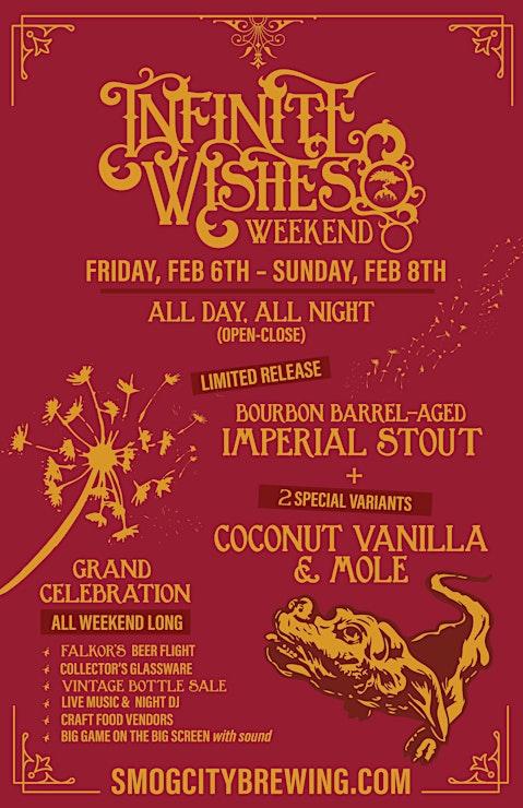 The 2026 edition of Infinite Wishes, Smog City’s stunning, Bourbon Barrel-Aged Imperial Stout and its two very special variants are releasing, and you can celebrate its inky, decadent beauty alongside delicious eats, boppin’ tunes, and lots of other Smog City goings-on at their Wishes Weekend Celebration from open to close all weekend long.