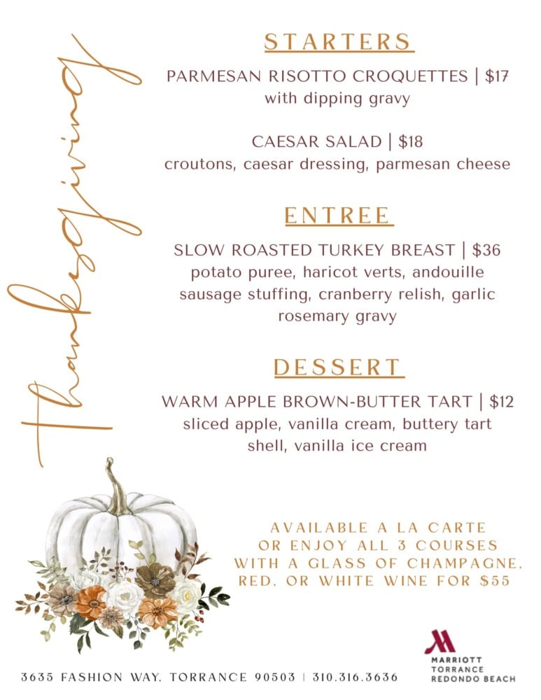 Join us at 21 Square Bar + Kitchen, inside the Torrance Marriott Redondo Beach, for a special Thanksgiving Day dining experience from 11:00 AM until close. Enjoy a festive $55 prix fixe menu or choose your favorites à la carte.
